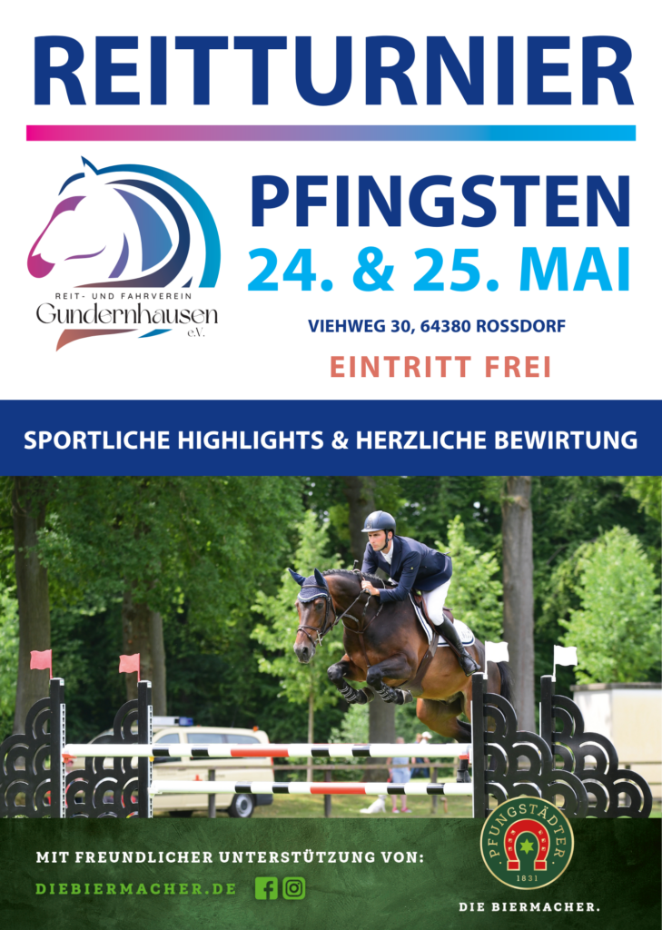 Springturnier 2026 bis Klasse M* Pfingstturnier 24.05.-25.05.2026 Ausschreibung herunterladen Zeiteinteilung herunterladen Unsere Sponsoren: Die Schirmherrschaft übernimmt die Gemeinde Rossdorf und der Bürgermeister Norman Zimmermann